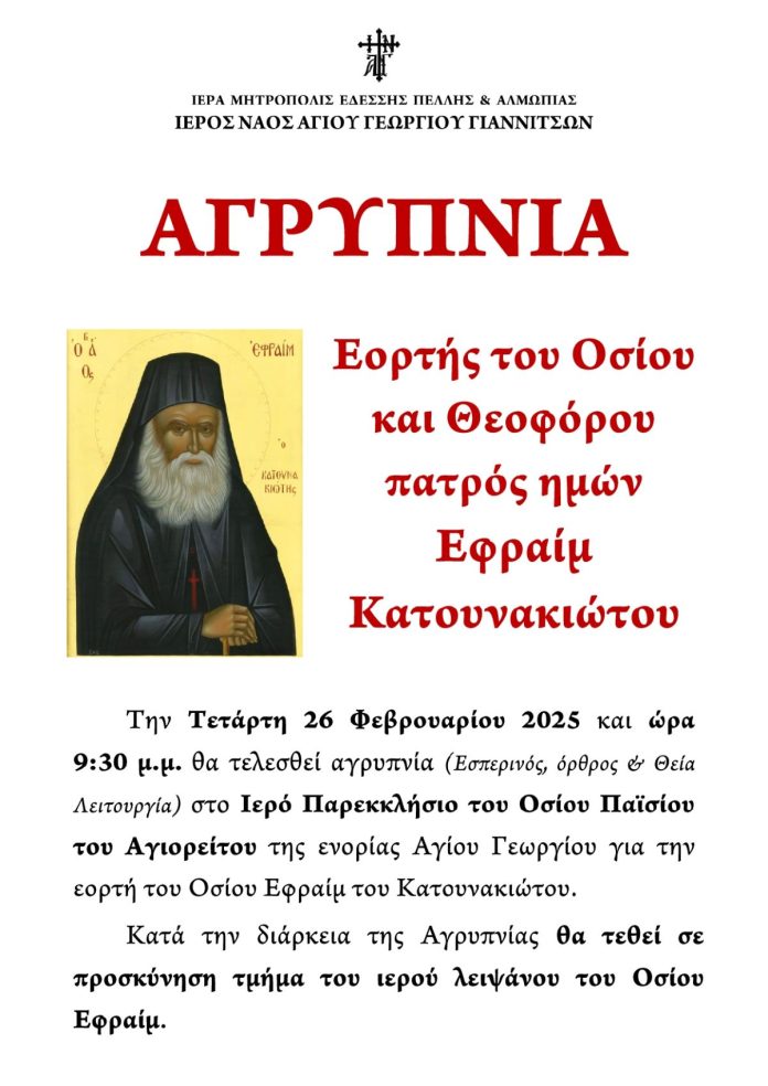 Την Τετάρτη 26 Φεβρουαρίου 2025 και ώρα 9:30 μ.μ. θα τελεσθεί Αγρυπνία (Εσπερινός, όρθρος και Θεία Λειτουργία) στο Ιερό Παρεκκλήσιο του Οσίου Παϊσίου του Αγιορείτου της ενορίας Αγίου Γεωργίου για την εορτή του Οσίου Εφραίμ του Κατουνακιώτου.
