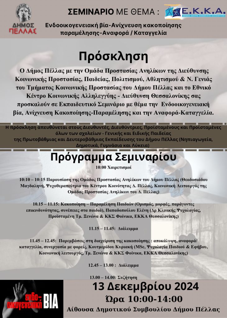 Δήμος Πέλλας: Εκπαιδευτικό Σεμινάριο με θέμα την Ενδοοικογενειακή Βία