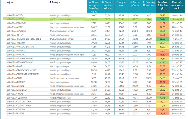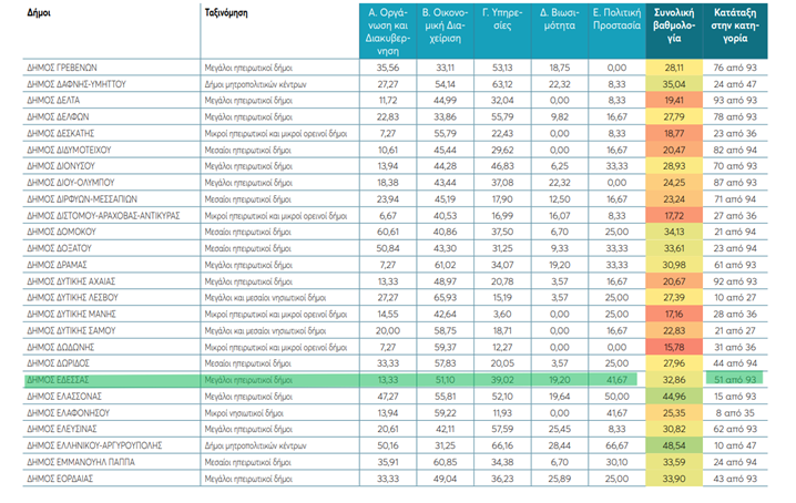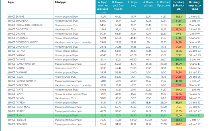 Ο Δήμος Πέλλας βρίσκεται και αυτός στο 20% των καλύτερων Δήμων, με συνολική βαθμολογία 43,06 καταλαμβάνοντας την 18η θέση στους 93.
