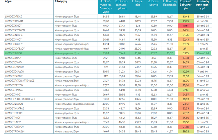 Ο Δήμος Σκύδρα συμμετείχε στην έρευνα και μάλιστα συμπεριλαμβάνεται στο καλύτερο 20% στην κατηγορία της οικονομικής διαχείρισης στους μεσαίους ηπειρωτικούς δήμους, έχοντας 65,42. Η συνολική βαθμολογία του Δήμου Σκύδρας είναι 33,15 και βρίσκεται στην 25η θέση. Στις υπόλοιπες κατηγορίες έχει συγκεντρώσει, στην οργάνωση και διακυβέρνηση 43,94 στις υπηρεσίες 16,98 στη βιωσιμότητα 22,77 και στην πολιτική προστασία 16,67.