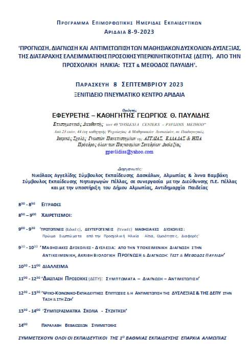 Ο διάσημος καθηγητής Γιώργος Παυλίδης, εφευρέτης της μεθόδου για την δυσλεξία την διάσπαση προσοχής, θα δώσει αύριο Παρασκευή 8 Σεπτεμβρίου, διάλεξη στο “ξενιτίδειο” της Αριδαίας.