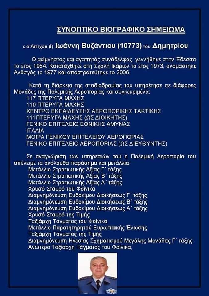 Συμπληρώνονται σήμερα 4 χρόνια από την στιγμή που Αντιπτέραρχος ε.α. Ιωάννης Βυζάντιος, αποφάσισε να ” πετάξει” οριστικά στους ουρανούς!!