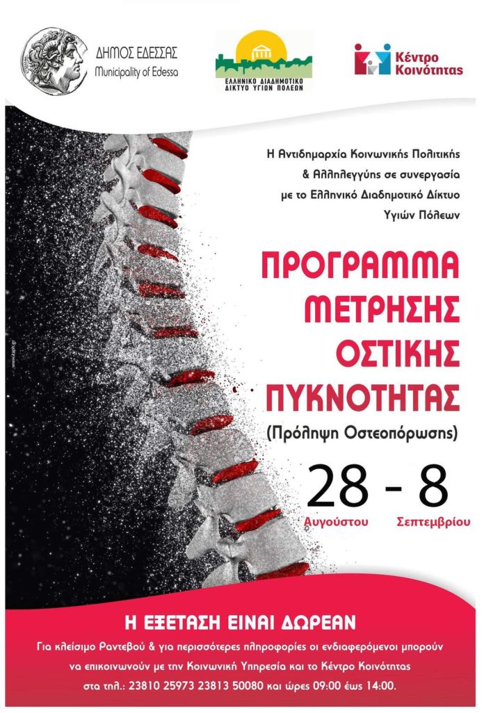 Για τρίτη φορά, από το 2020,με πρωτοβουλία της Αντιδημαρχίας Κοινωνικής Πολιτικής & Αλληλεγγύης του Δήμου Έδεσσας και σε συνεργασία με το Ελληνικό Διαδημοτικό Δίκτυο Υγιών Πόλεων (ΕΔΔΥΠΠΥ) και το Κέντρο Κοινότητας του Δήμου Έδεσσας, διοργανώνεται πρόγραμμα μέτρησης οστικής πυκνότητας για την πρόληψη της οστεοπόρωσης.