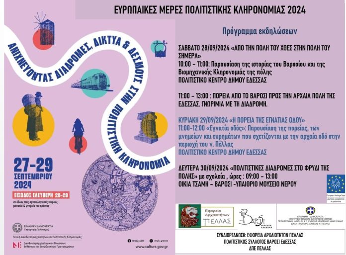 Στο πλαίσιο του εορτασμού των Ευρωπαϊκών Ημερών Πολιτιστικής Κληρονομιάς 2024, με το γενικό τίτλο «Ανιχνεύοντας Διαδρομές, Δίκτυα και Δεσμούς στην Πολιτιστική Κληρονομιά», η Εφορεία Αρχαιοτήτων Πέλλας, σε συνεργασία με τον Πολιτιστικό Σύλλογο «Βαρόσι Έδεσσας» και τη Διεύθυνση Πρωτοβάθμιας Εκπαίδευσης Πέλλας, διοργανώνει στην Έδεσσα τις παρακάτω εκδηλώσεις: