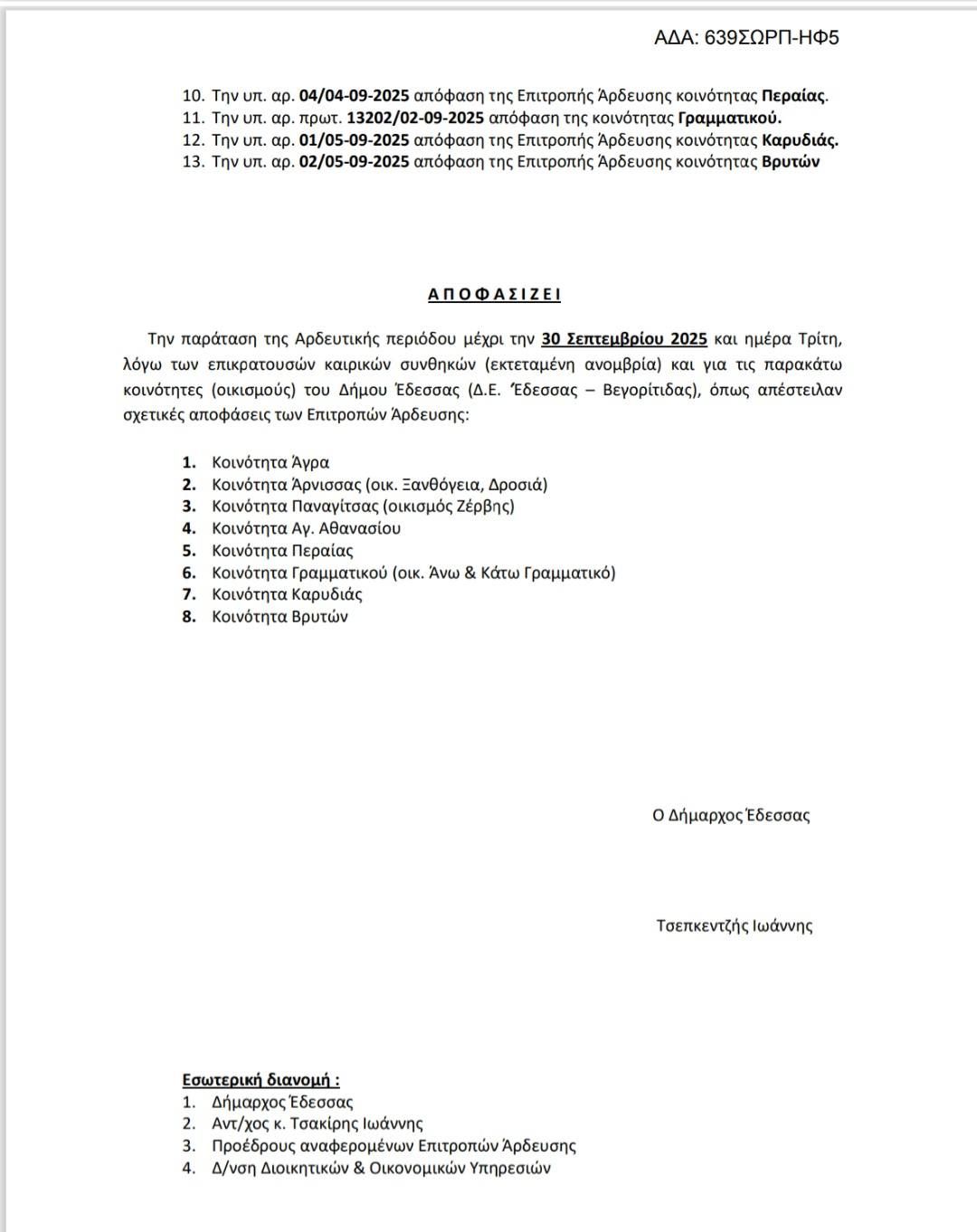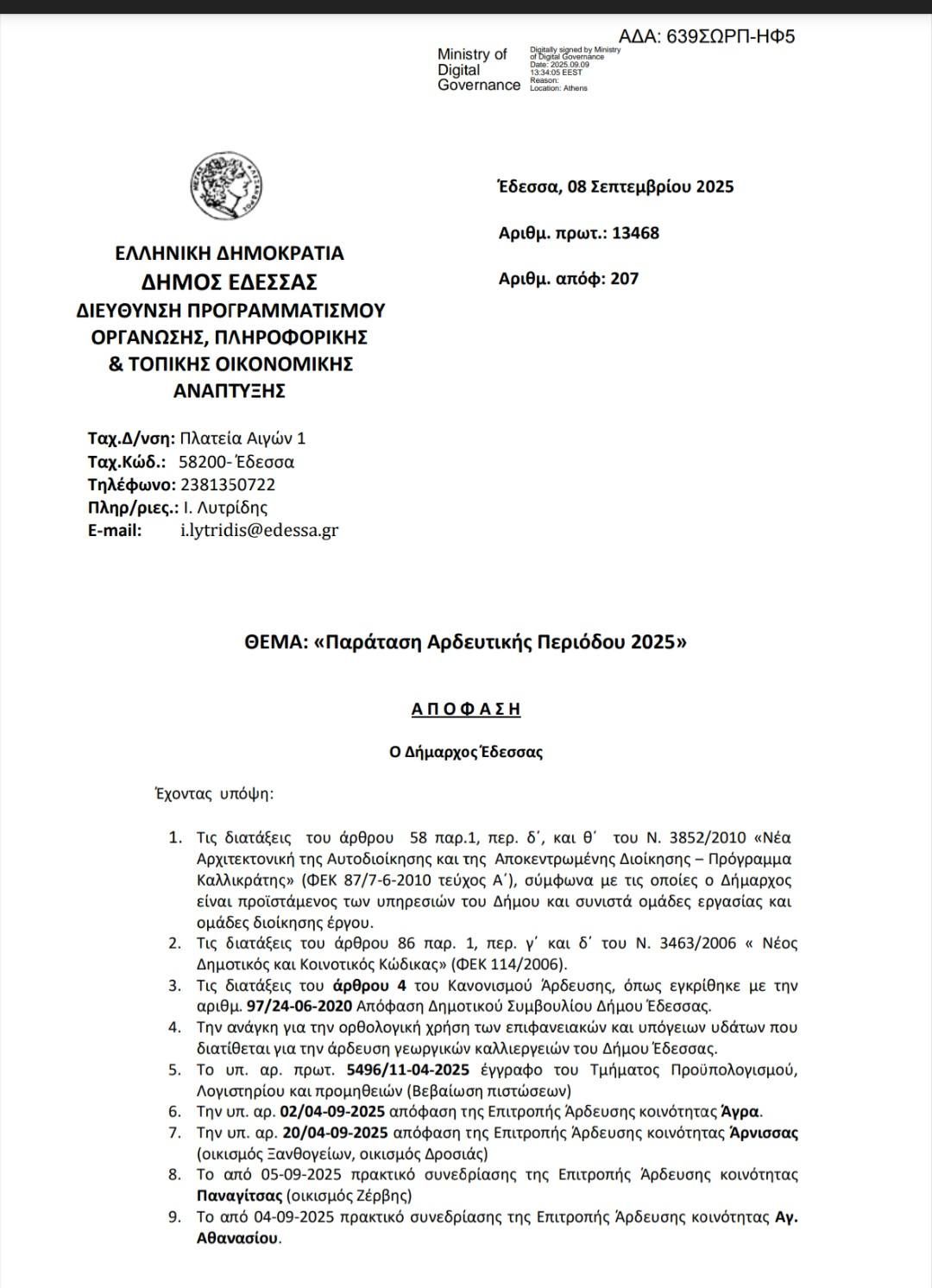 Η αγροτική οικονομία του Δήμου Έδεσσας εξαρτάται άμεσα από την αρδευτική περίοδο. Οι αγρότες σχεδιάζουν, επενδύουν και παράγουν με βάση τις αποφάσεις της Δημοτικής Αρχής. Δυστυχώς, ο Δήμαρχος κ. Ιωάννης Τσεπκεντζής απέδειξε για ακόμη μια φορά πόσο απρόβλεπτος –και επιζήμιος– μπορεί να γίνει.