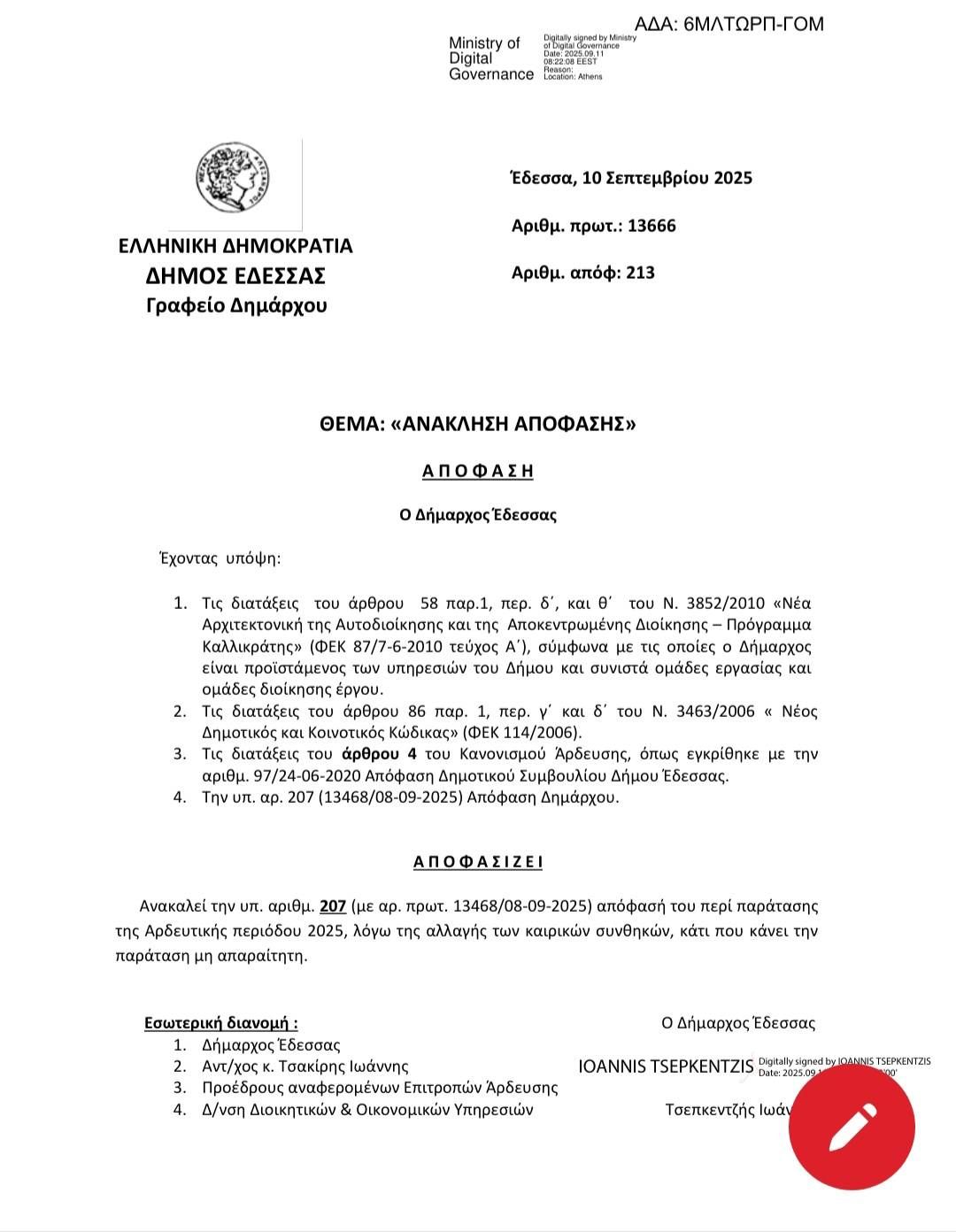 Στις 8 Σεπτεμβρίου 2025 υπέγραψε απόφαση (ΑΔΑ: 639ΣΩΡΠ-ΗΦ5) με την οποία, απολύτως ορθά, παρατεινόταν η αρδευτική περίοδος έως τις 30 Σεπτεμβρίου, λόγω της εκτεταμένης ανομβρίας και ύστερα από σχετικές αποφάσεις των Επιτροπών Άρδευσης των κοινοτήτων. Μόλις δύο ημέρες αργότερα, στις 10 Σεπτεμβρίου, με νέα απόφασή του (ΑΔΑ: 6ΜΛΤΩΡΠ-ΓΟΜ) ανακάλεσε την ίδια του την απόφαση, επικαλούμενος «αλλαγή των καιρικών συνθηκών».