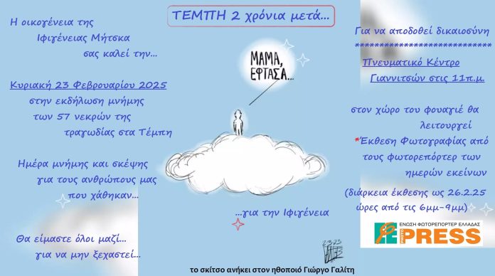 Σε λίγες ημέρες συμπληρώνονται δυο χρόνια από το τραγικό σιδηροδρομικό δυστύχημα στα Τέμπη. Φτάνοντας στην δεύτερη επέτειο μνήμης, η οικογένεια της Ιφιγένειας Μήτσκα διοργανώνει μια εκδήλωση για την 23χρονη κόρη τους, την Κυριακή 23 Φεβρουαρίου στο Πνευματικό Κέντρο Γιαννιτσών στις 11 το πρωί. Με την υποστήριξη όλων και την συμμετοχή ομιλητών από τους υπόλοιπους συγγενείς των 57, με τους συμμαθητές της Ιφιγένειας να μιλούν γι’ αυτήν, με ένα μοναδικό βίντεο με τις εικόνες όλων των θυμάτων και με την παρουσία όλων των συγγενών, η αίθουσα θα γεμίσει φωνή ελπίδας ότι όλα αυτά τα παιδιά, όλοι αυτοί οι νέοι άνθρωποι θα βρουν δικαίωση…