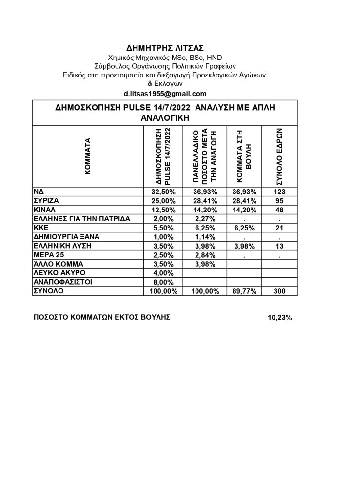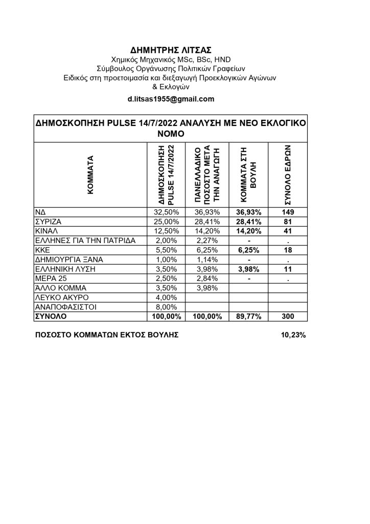 Τα δημοσκοπικά ευρήματα της εταιρίας PULSE αναφορικά με την κατανομή των εδρών σε πανελλαδικό επίπεδο αλλά και ανά περιφερειακή ενότητα είναι ιδιαίτερα ενδιαφέροντα και αφορούν το νομό Πέλλας. Η έρευνα  αυτή έγινε για λογαριασμό του ΣΚΑΙ. Ο έγκριτος αναλυτής ΔΗΜΗΤΡΗΣ ΛΙΤΣΑΣ Χημικός Μηχανικός MSc, BSc, HND Σύμβουλος Οργάνωσης Πολιτικών Γραφείων Ειδικός στη προετοιμασία και διεξαγωγή Προεκλογικών Αγώνων και εκλογών, παρουσίασε μια υποθετική ανάλυση αναφορικά με την κατανομή των εδρών στην περίπτωση της απλής αναλογικής αλλά και της ενισχυμένης του εκλογικού συστήματος Θεοδωρικάκου όπως έχει παρουσιαστεί και ισχύει. Καταρχήν σύμφωνα με τα δημοκοπικά στοιχεία αλλά και την αναγωγή, θα σχηματιστεί Βουλή με τη ΝΔ, τον ΣΥΡΙΖΑ, ΤΟ ΠΑΣΟΚ, ΤΟ ΚΚΕ και την Ελληνική Λύση ενώ μένει έξω το ΜΕΡΑ  25 του Γιάνη Βαρουφάκη. Αυτό σημαίνει πως μιλάμε για πεντακομματική Βουλή. Άλλο ένα στοιχείο της δημοσκόπησης σε σχέση με άλλες, είναι το ποσοστό της Ελληνικής Λύσης που είναι υπό εκτιμημένο καθώς καταγράφει 4% ενώ άλλες δημοσκοπήσεις το έχουν μέχρι και στο 6,5%.