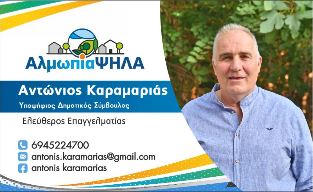 Στο πλευρό του Νίκου Παρούτογλου ο Αντώνης Καραμαριάς που κατεβαίνει υποψήφιος Δημοτικός Σύμβουλος. Ζητά τη στήριξη των συμπολιτών του με δυναμισμό και διεκδικεί τη θέση του Δημοτικού συμβούλου με τον συνδυασμό “Αλμωπία Ψηλά”.