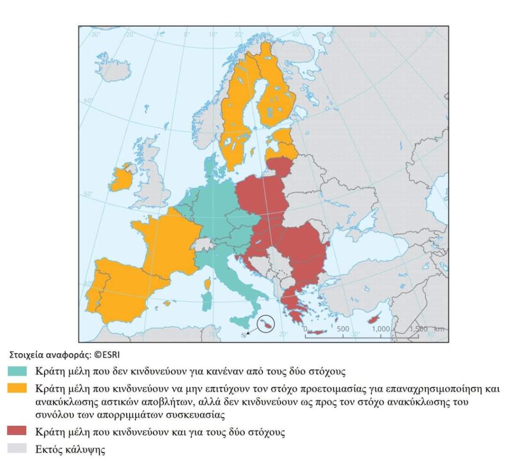 Η έκθεση, που δημοσιοποιήθηκε χθες, αφορά τις επιδόσεις των κρατών-μελών της Ε.Ε. στη διαχείριση των αστικών αποβλήτων και την ανακύκλωση. Σύμφωνα με την έκθεση αυτή, η Ελλάδα ανήκει στην ομάδα των χωρών που κινδυνεύουν να μην επιτύχουν τους στόχους για τα αστικά απόβλητα (ανακύκλωση ή προετοιμασία για επαναχρησιμοποίηση του 55% έως το 2025), για την ανακύκλωση συσκευασιών (65% έως το 2025 με ειδικότερους στόχους ανά υλικό) και τη μείωση της ταφής απορριμμάτων (έως 10% έως το 2035).