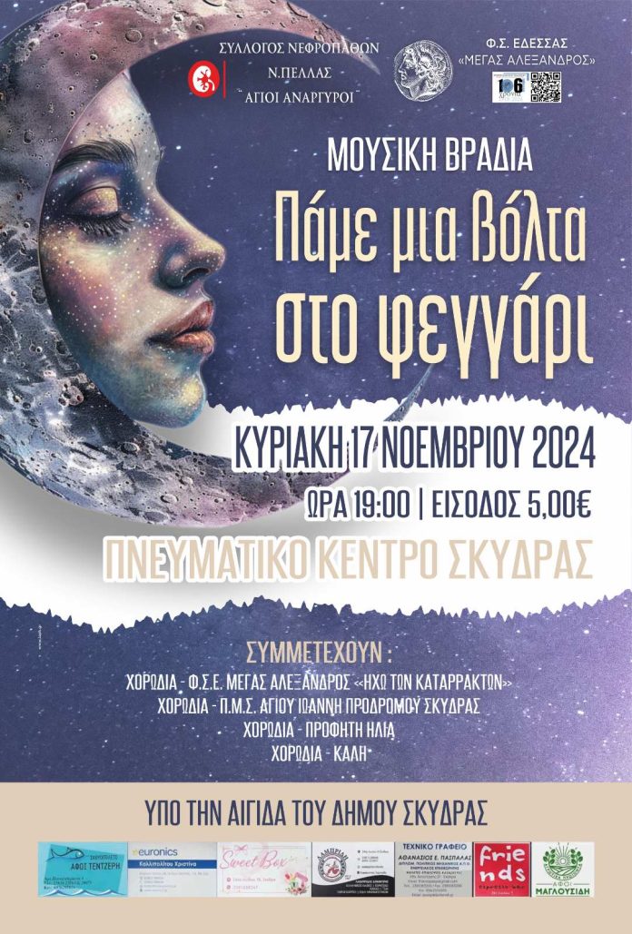 Την Κυριακή 17 Νοεμβρίου 2024, στις 7.00 το απόγευμα, στο Πνευματικό Κέντρο του Δήμου Σκύδρας, οι χορωδίες του Φιλοπρόοδου Συλλόγου Έδεσσας «Μέγας Αλέξανδρος» η «Ηχώ των καταρρακτών», του Π.Μ.Σ. Αγ.Ιωάννη Προδρόμου Σκύδρας, Καλής και Προφήτη Ηλία ενώνουν τις δυνάμεις τους για να μας πάνε βόλτα στο φεγγάρι. Εκεί θα σεργιανίσουμε παρέα με γνωστές μελωδίες και τραγούδια.