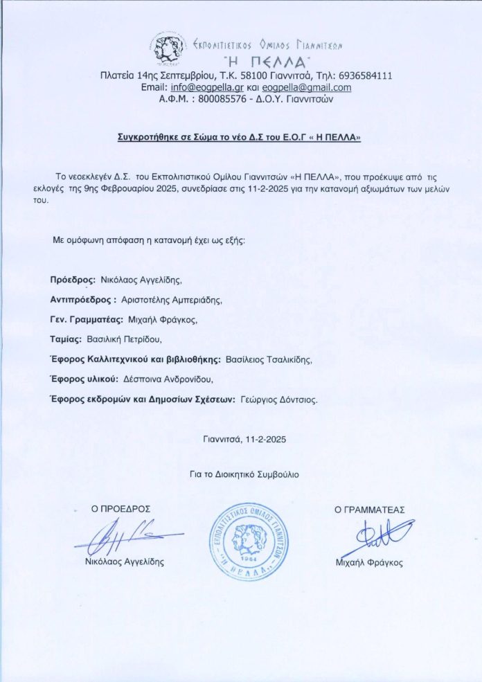 Το νεοεκλεγέν Δ.Σ. του Εκπολιτιστικού Ομίλου Γιαννιτσών «Η ΠΕΛΛΑ», που προέκυψε από τις εκλογές της 9ης Φεβρουαρίου 2025, συνεδρίασε στις 11-2-2025 για την κατανομή αξιωμάτων των μελών του.