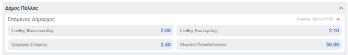Η εταιρία ΣΤΟΙΧΗΜΑΝ που το πλειοψηφικό πακέτο διαθέτει το ΠΑΜΕ ΣΤΟΙΧΗΜΑ, ανέβασε τις αποδόσεις για Δημοτικές εκλογές. Από πλευράς Π.Ε. Πέλλας υπάρχει μόνο ένας Δήμος αυτός της Πέλλας. Σύμφωνα λοιπόν με τα στοιχεία, πρώτο φαβορί για νέος Δήμαρχος παρουσιάζεται ο Στάθης Φουντουκίδης με απόδοση στο 2. Μετά έρχεται ο Στάθης Καστερίδης με 2,10 και τρίτος ο Γρηγόρης Στάμκος με 2,40. Για τους γνώστες του στοιχήματος όλοι μπορούν να καταλάβουν πως οι μεταβλητές ανάμεσα στους δυο πρώτους είναι ρευστές ενώ θεωρούν ποιο δύσκολο να επανεκλεγεί ο κος Στάμκος. Το προβάδισμα βέβαια στον Στάθη Φουντουκίδη υποδηλώνει πως έχει φαβορί για την είσοδο στον δεύτερο γύρο.