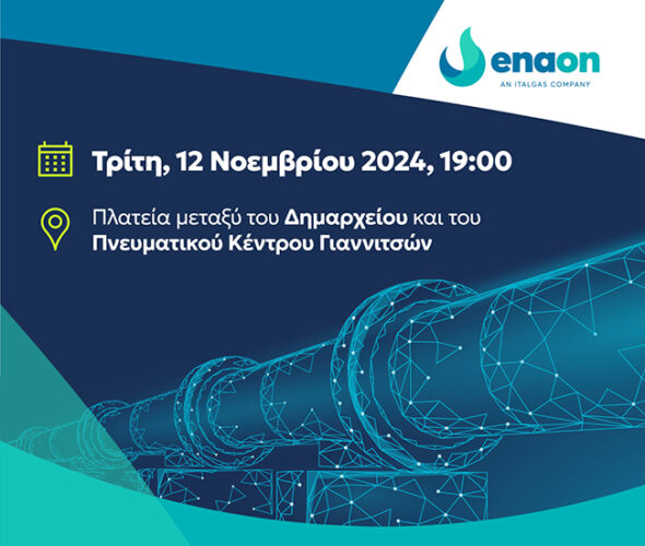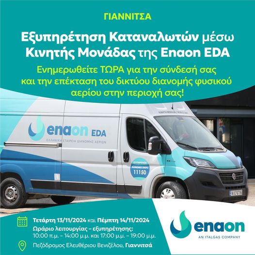 Η Enaon EDA, η Ελληνική Εταιρεία Διανομής Αερίων, θυγατρική της Enaon, ανακοινώνει ότι η κινητή μονάδα εξυπηρέτησης καταναλωτών θα βρίσκεται στα Γιαννιτσά για την εξυπηρέτηση των κατοίκων που ενδιαφέρονται να συνδεθούν με το δίκτυο διανομής φυσικού αερίου.