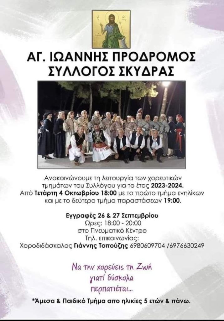 Ανακοινώθηκαν τα χορευτικά τμήματα του πολιτιστικού συλλόγου Σκύδρας “Αγ. Ιωάννης Πρόδρομος” για την φετινή σεζόν.