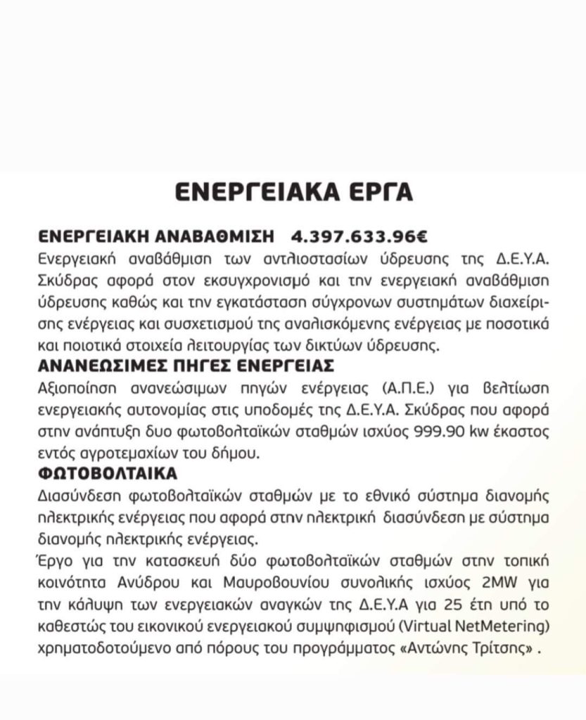 Βρισκόμαστε σε προεκλογική περίοδο…Με θεμιτά και αθέμιτα μέσα προσπαθείτε να μαζέψετε κανέναν σταυρό…Δικαίωμα σας…Δημοκρατία λέμε οτι έχουμε…Η μικροπολιτική και η λάσπη έχουν όμως και τα όρια τους.Εθνοσωτήρες του τόπου,λύσεις με υπομονή και επιμονή εχω δώσει πολλές και μία απο αυτές είναι και για το ενεργειακό πρόβλημα της ΔΕΥΑ ΣΚΥΔΡΑΣ..Ενεργειακό πρόβλημα υπάρχει πανελλαδικά στις ΔΕΥΑ με τα χρέη να αγγίζουν τα 150 εκατομμύρια ευρώ.Να ενημερώνεστε…είμαι πάντα στη διάθεση σας.