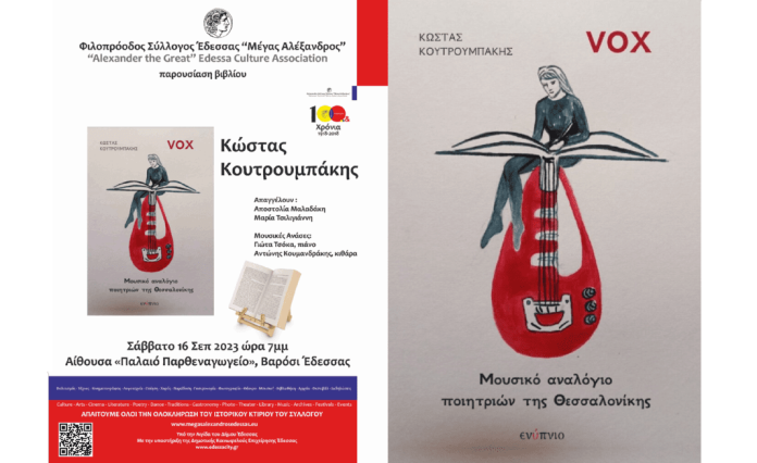 Ο Φιλοπρόοδος Σύλλογος Έδεσσας «Μέγας Αλέξανδρος» παρουσιάζει το βιβλίο-cd του Κώστα Κουτρουμπάκη, «Vox, Μουσικό αναλόγιο ποιητριών της Θεσσαλονίκης» εκδ. Ενύπνιο 2023, το Σάββατο 16 Σεπτεμβρίου 2023 στις 7.00 το απόγευμα, στο Παρθεναγωγείο (Βαρόσι, Έδεσσα).